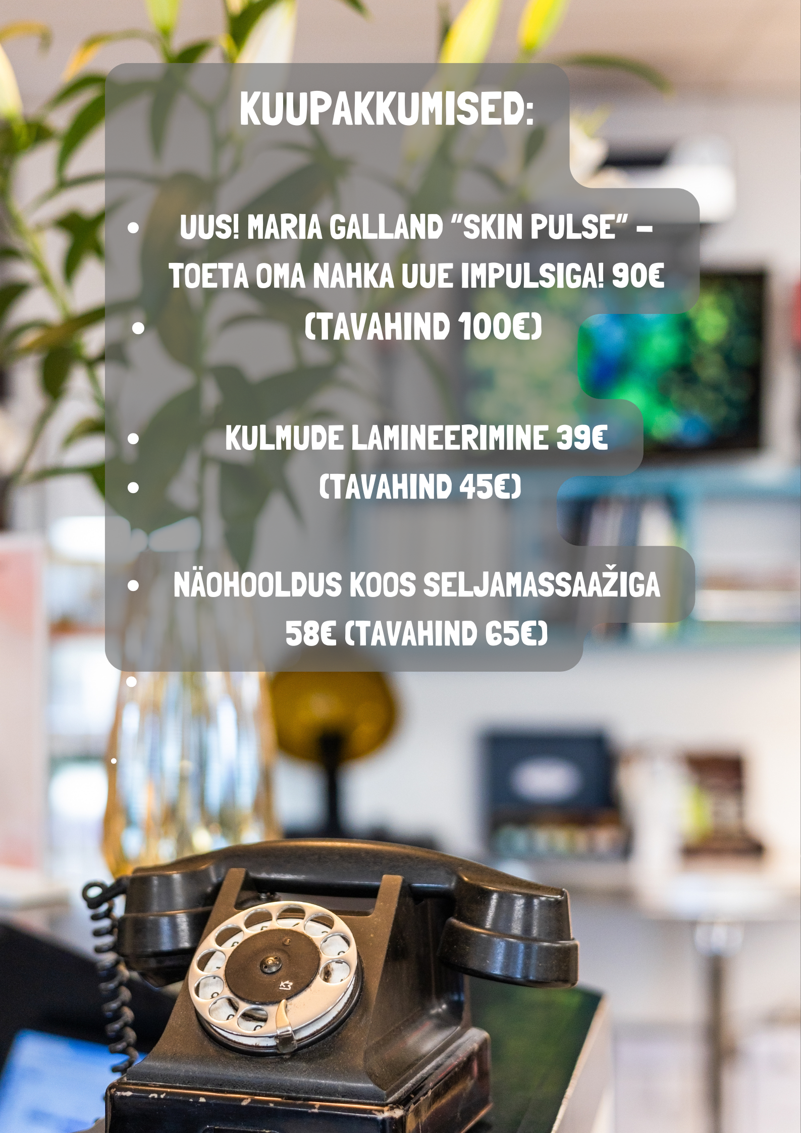 Professionaalne jumestus rõhutab sinu loomulikku ilu ja sobib igaks sündmuseks, olgu see päevane meik, õhtune pidulik jumestus, pruudimeik või eriline look koolilõpetajale. Meie kogenud kosmeetikud ja jumestuskunstnik Gerli loovad stiili, mis sobib sinu näojoonte ja eelistustega, et tunneksid end enesekindla ja säravana. Kui broneerimissüsteem ei näita aega jumestuseks, helista meile tel: 666 0 400, Gerli juurde broneerime aega ka kokkuleppel.