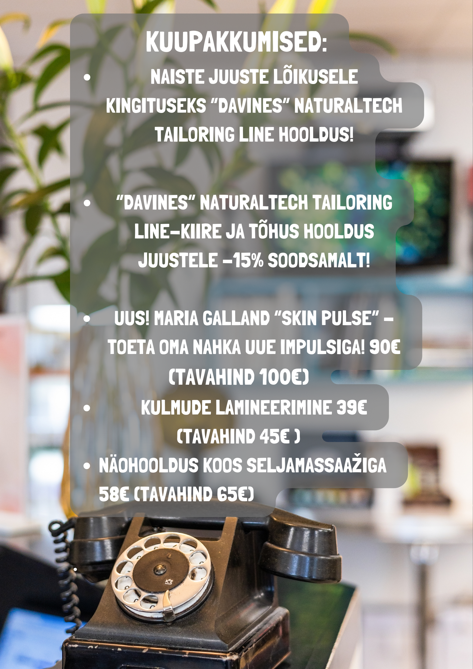 45 min - Hind sisaldab personaalset konsultatsiooni, põhjalikku peanahamassaaži, viimistlusvahendeid ja föönitamist.